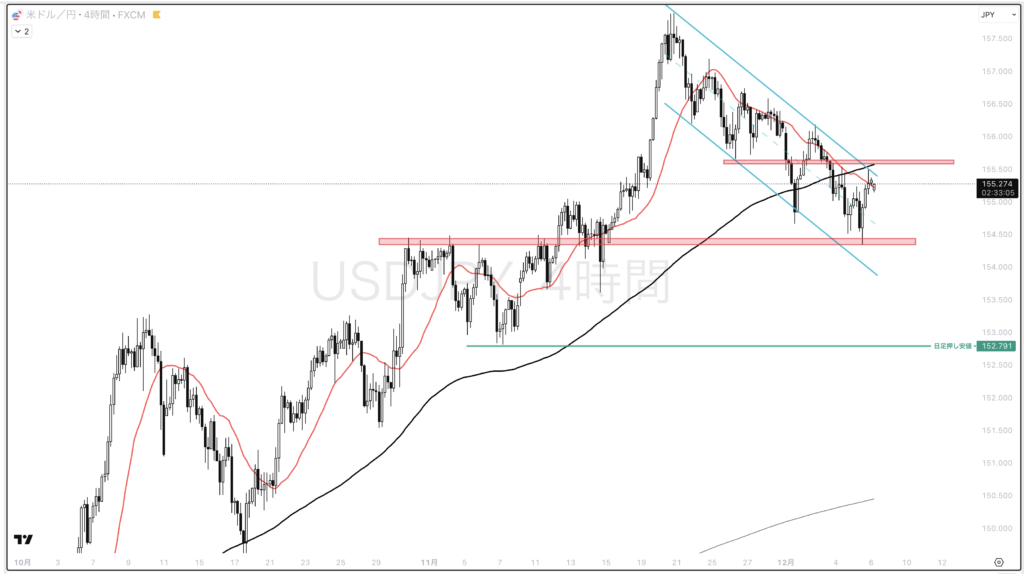 下降チャネル内。過去の高止まりラインで反発、4時間戻り高値を超え、先週5日金曜日23時に直近高値付近まで上昇し高止まり。売り・買い、どちらが優勢になるか?