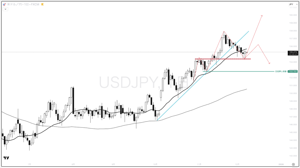 上昇トレンド中。赤線で反発、下ヒゲで陽線が出ている。調整が終わったら上昇か?日足押し安値割っていない。ただし、トレンドライン下に割っている。レートが20maを下回っている。一旦上昇するが、前回高値越えられず戻り売りダブルトップとなり下降になるか?