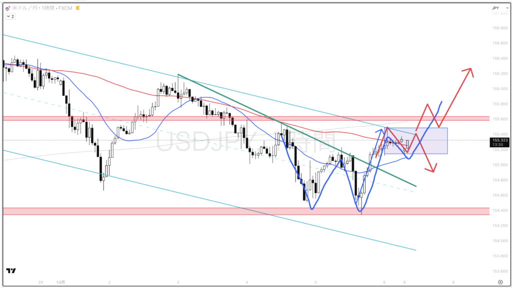 緑の下降トレンドライン上抜け、1時間戻り高値超え、売り勢力解消し上昇中。