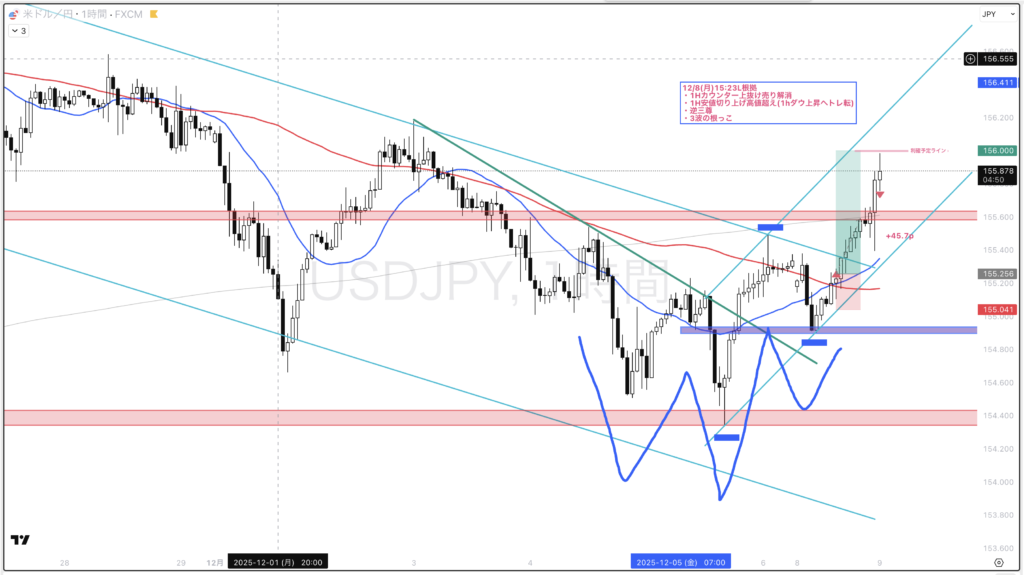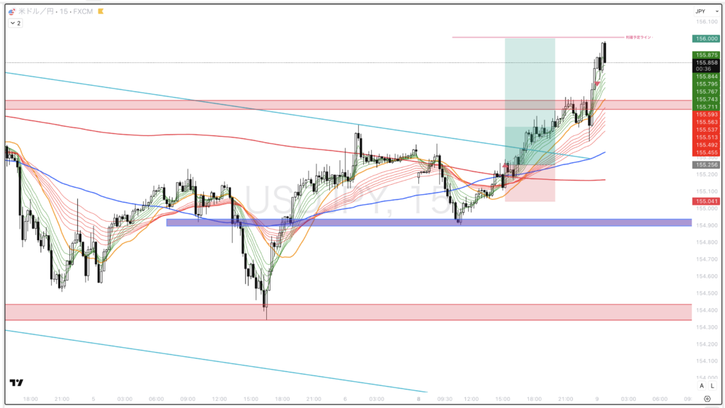 156.0円を利確予定にしていたが、23時台に日本で大きな地震があり、そのためかドル円チャートも荒れた。利確位置手前で手動決済。
