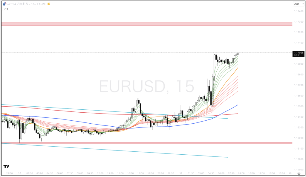 監視通過の中でポンドが一番強そう。週足20maも超えてきた。水色並行チャネル上限までまだ距離があるので、伸びそう。