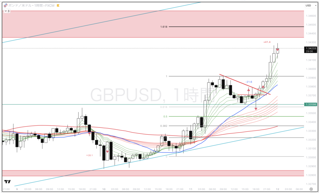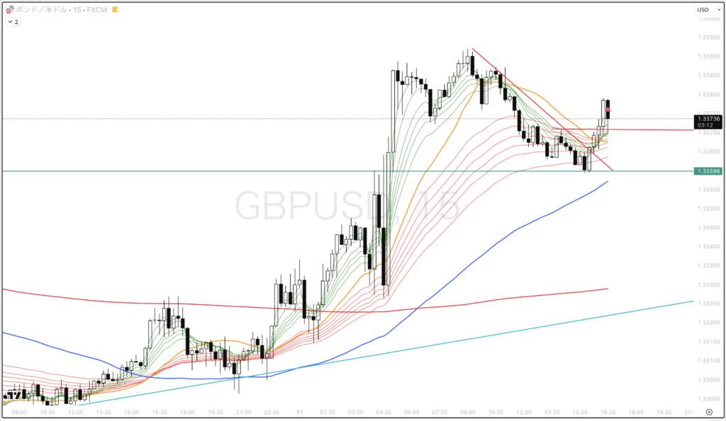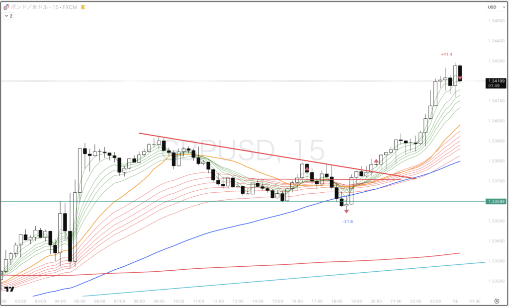 - 15分足ナナメトレンドライン(赤)上抜けした