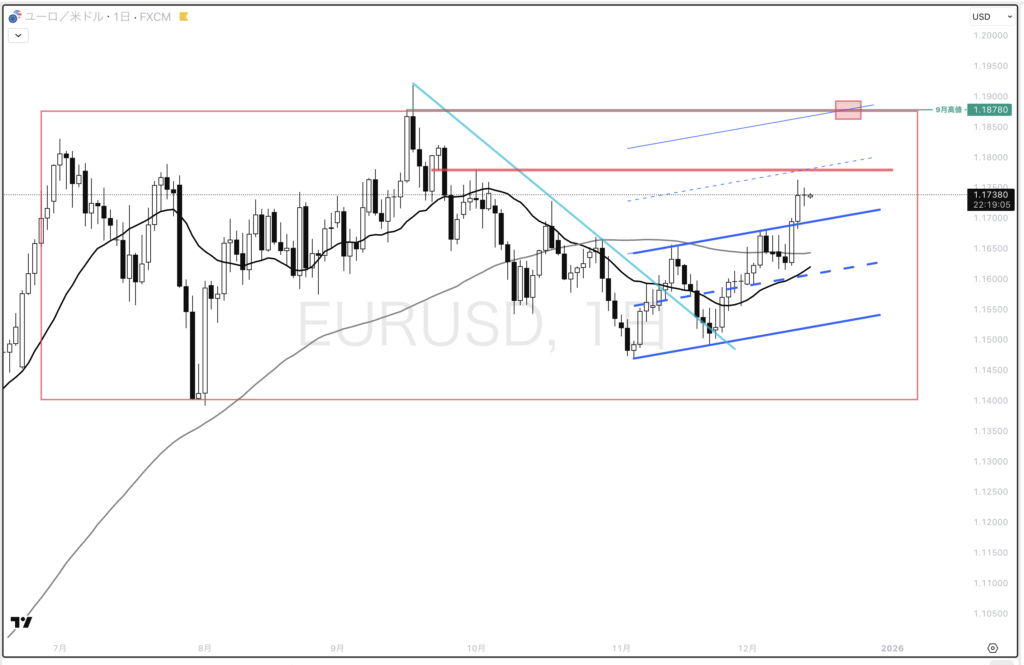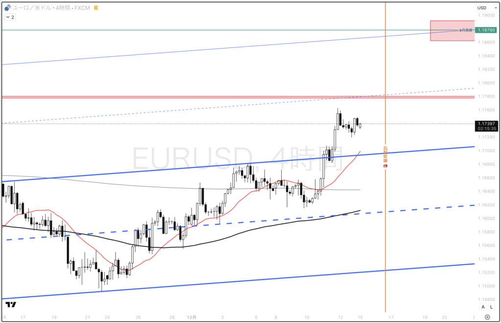 4時間戻り高値も抜け上昇中。大きくみるとレンジの中。9月の高値まで100pips以上ある。