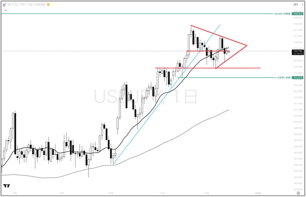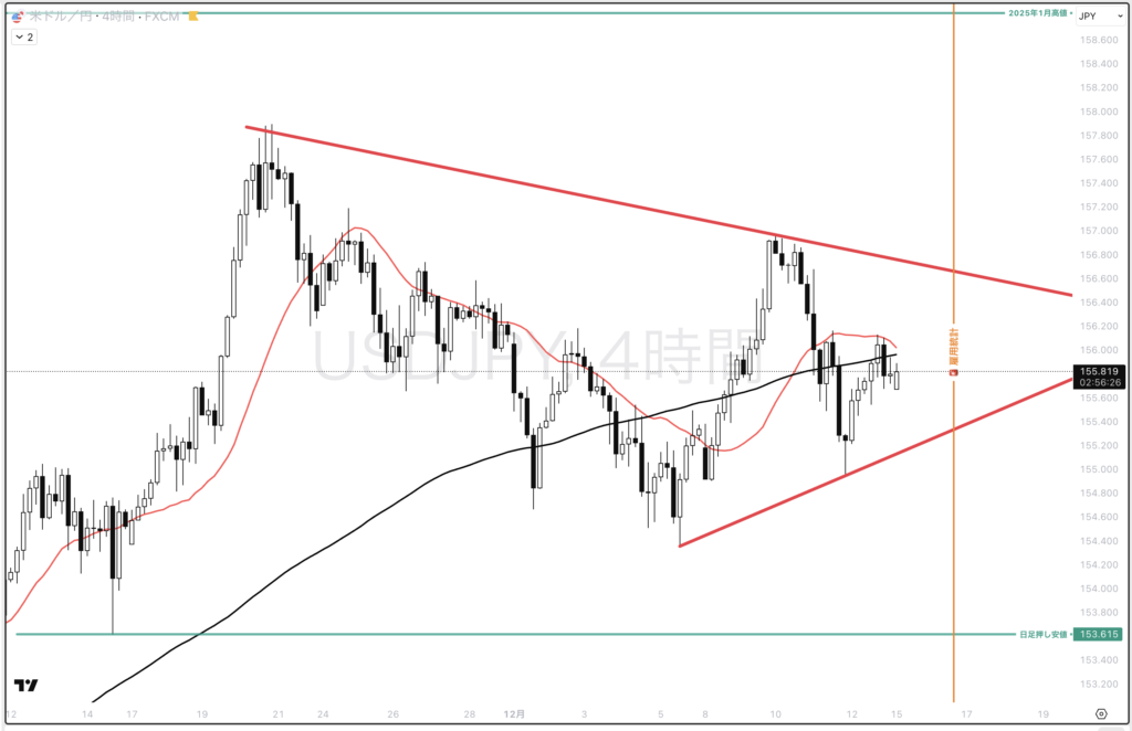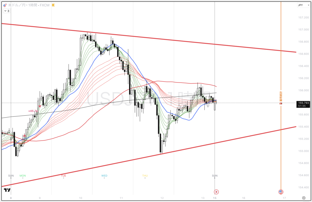 キレイに三角の中。明日22:30🇺🇸雇用統計まで三角の中かな〜。でも1円以上値幅がある。