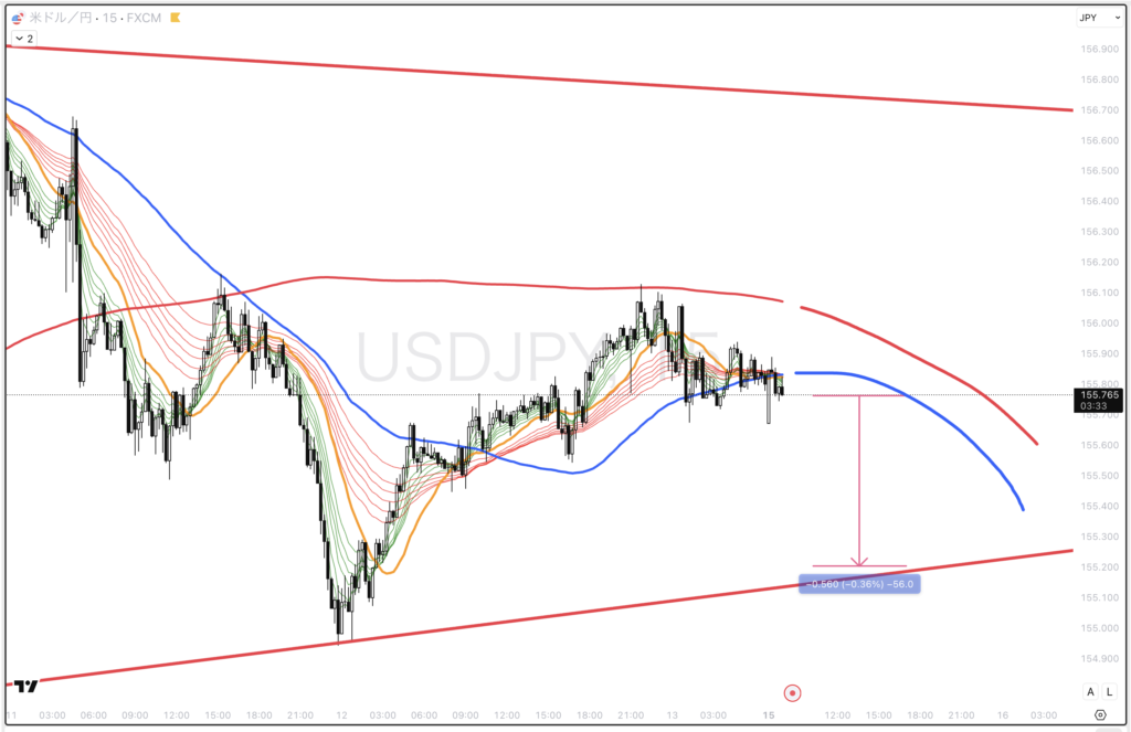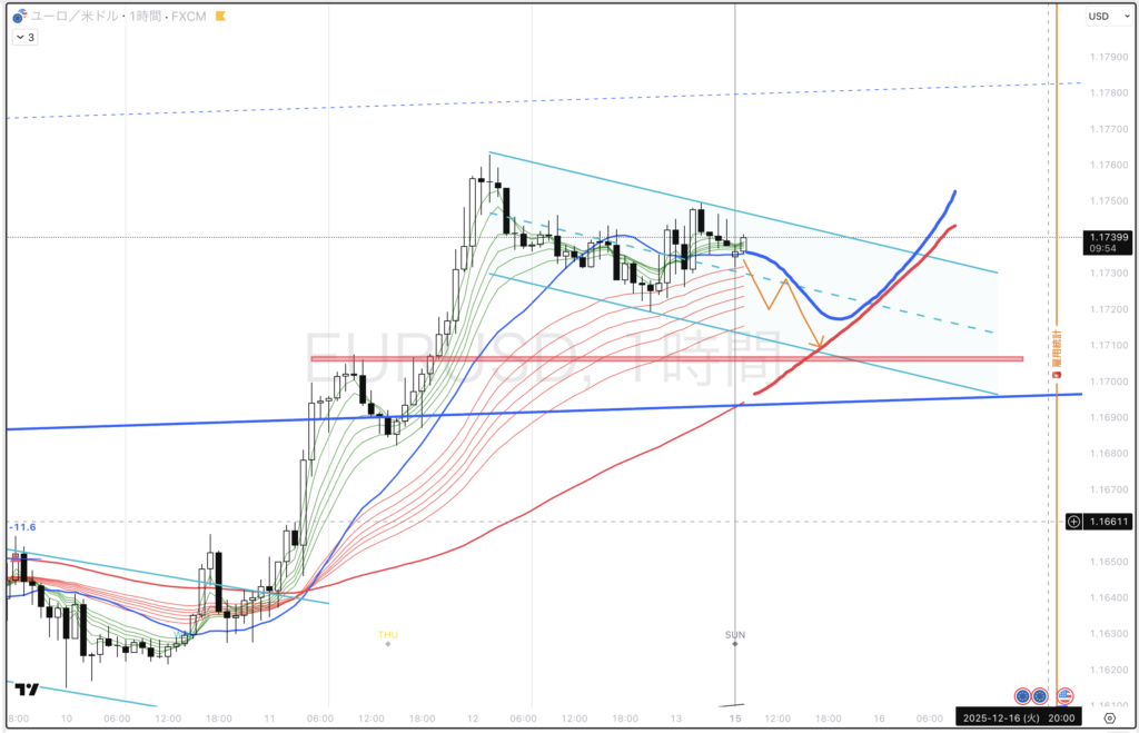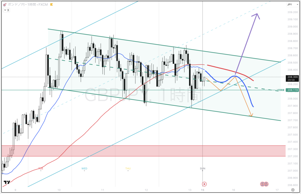 4時間の調整波中、1時間下降中(角度緩い)。画像に描いた通りのmaPOになれば売りも検討できるかな〜。