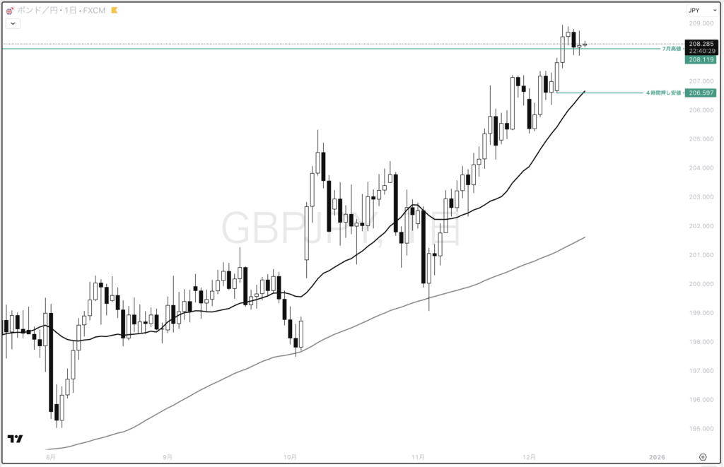 先週、今年7月の高値も超え上昇中。日足20maが伸び切っていて、乖離してきている。