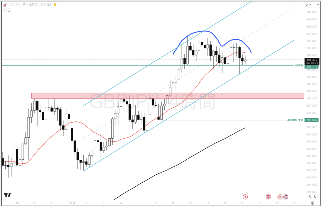 キレイな上昇トレンド中。調整がどこまで行くか。水色並行チャネル下限で反発して再上昇するか、下に突き抜けて赤帯ネックラインまで下落するか…?