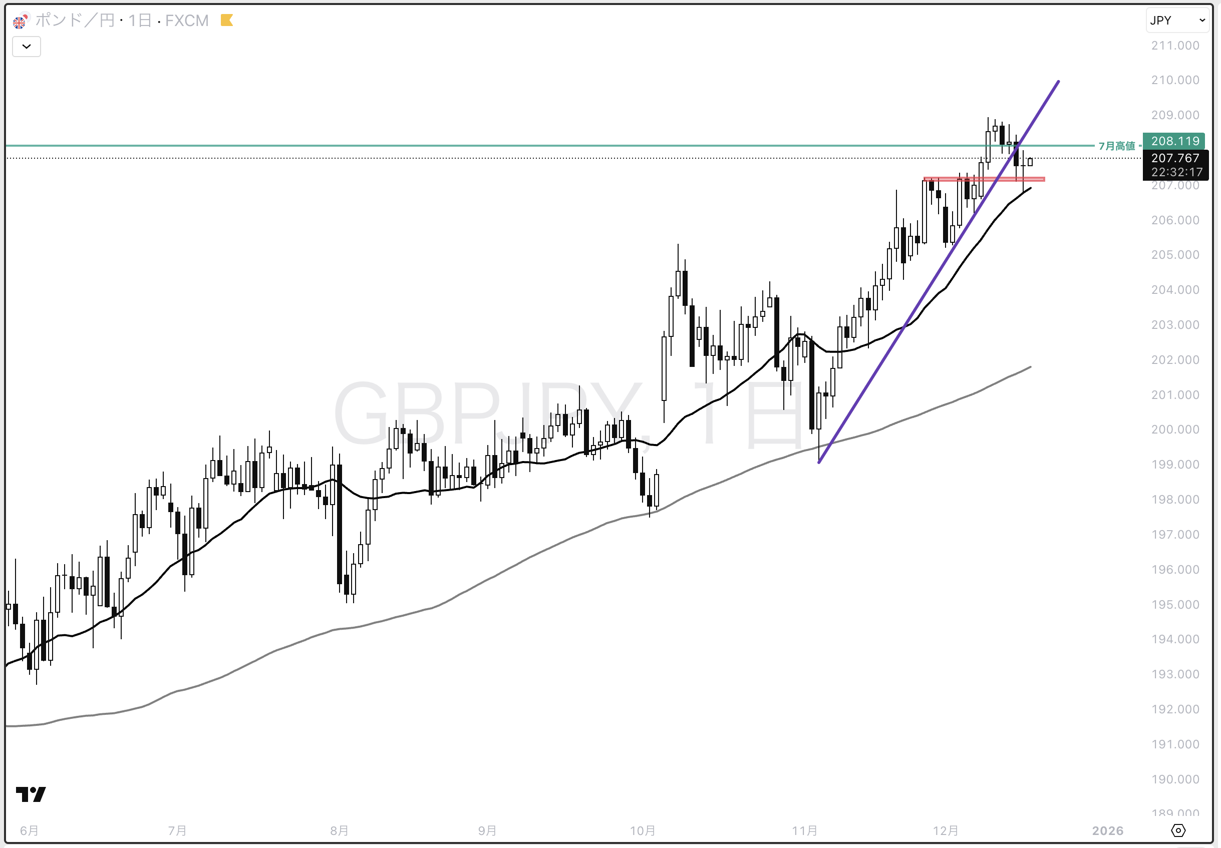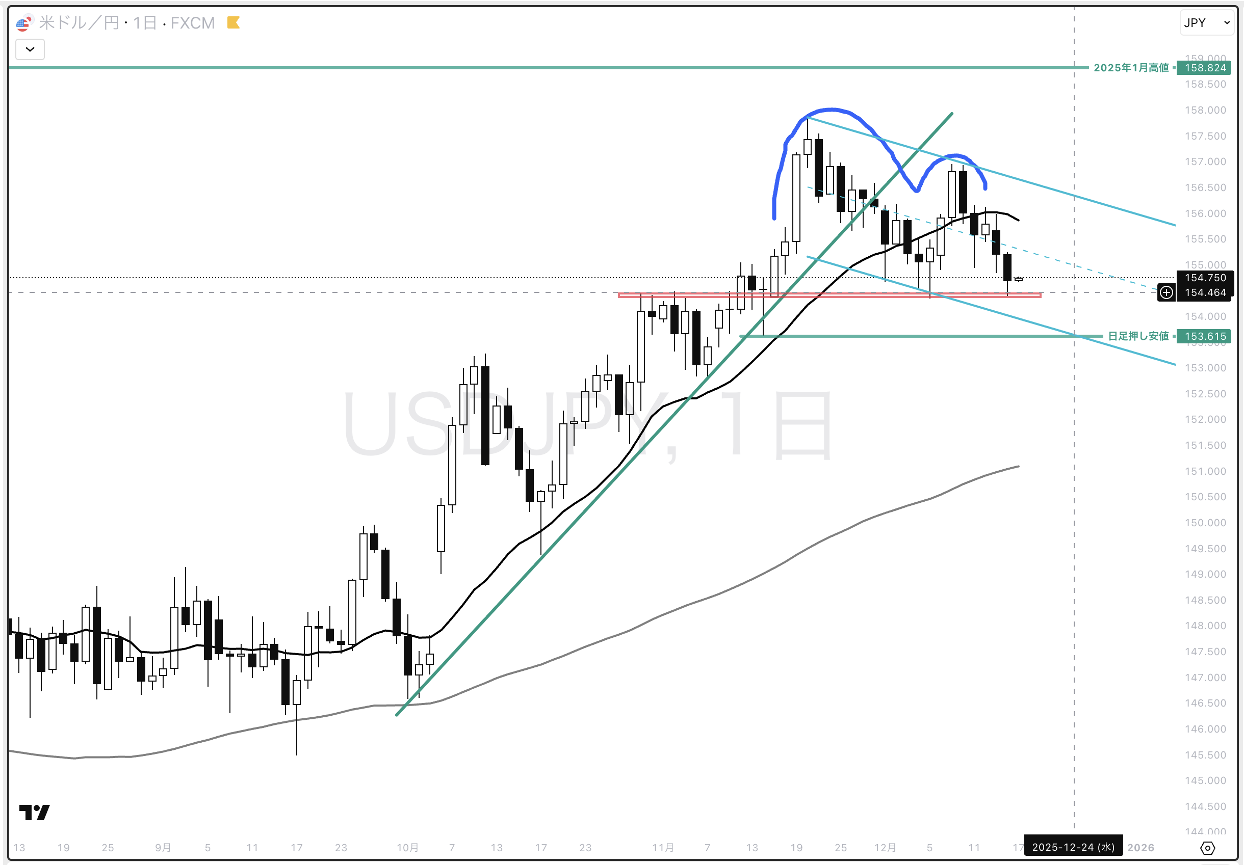 日足は上昇トレンド中だが、紫トレンドライン割ってきた。買い勢力弱まっている。