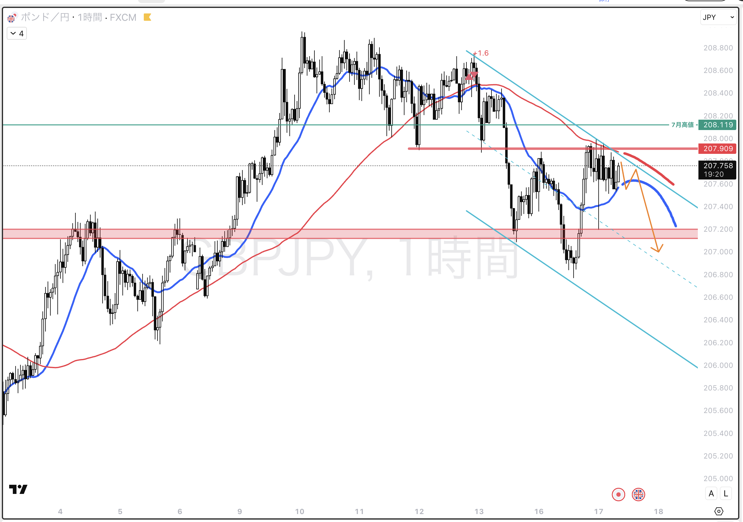 下降トレンド中。サポートラインで反発。戻り目作るために上昇したら戻り売りを狙いたい。