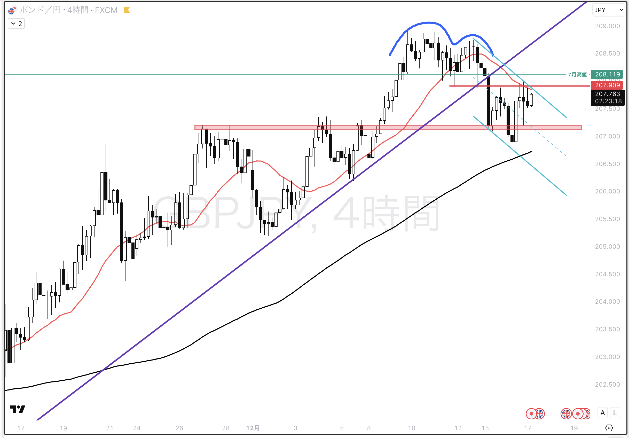 紫トレンドライン下割った。ダブルトップで高値きり下がり、下降トレンド。レジサポ転換。水色並行チャネルの上限あたりなので、下位足でチャートパターン形成しネック割れしたら売ってみたい。
