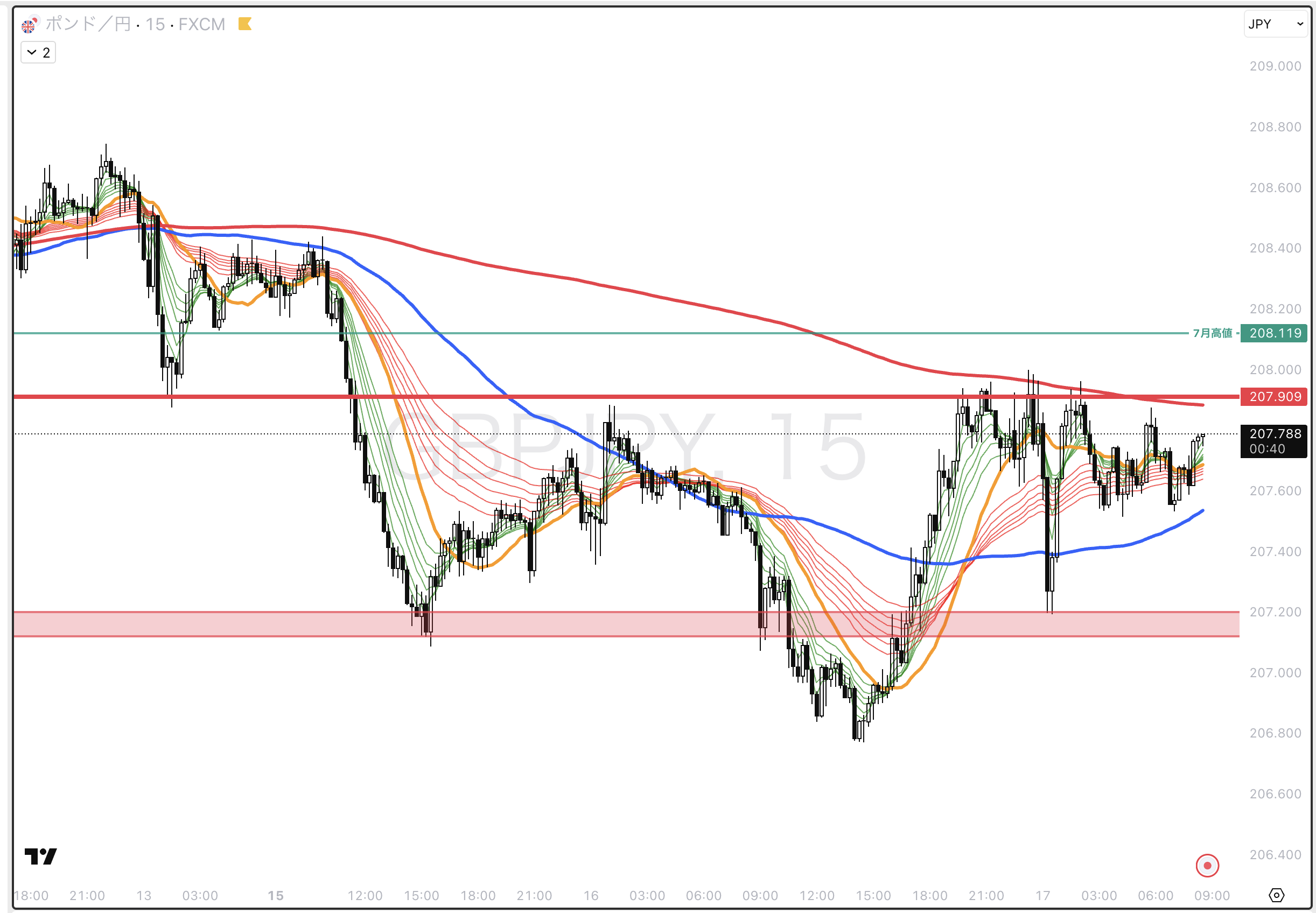 昨日は東京で下げて、ロンドンで上げて、NYでレンジ。レジサポラインで止まった。水色並行チャネル上限。15分足で下降maPOになったら売り狙いたい。