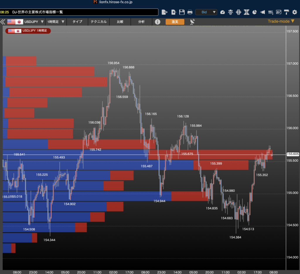 昨日は大陽線。一日かけてずっと上昇、1円以上動いた。レジサポラインで支えられ下げ止まり。高値き切り下がりで、売りと買いが拮抗している状態。現在は日足20maに抑えられた場所にいる。