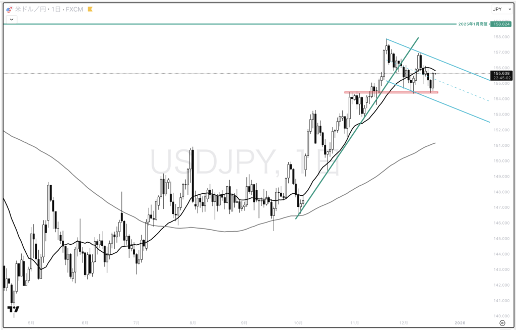 高値切り下がり、安値更新できず。4時間20ma(赤)と日足20ma(黒)サンドイッチ状態。方向感わからない。今日と明日はイベント続きなので通過するまでレンジかな〜。