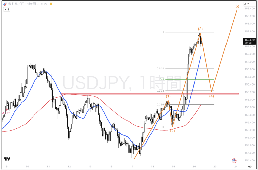 第3波大きく伸びた。調整波どこまで下がるか。ちょうどフィボ61.8%あたりにサポートライン。