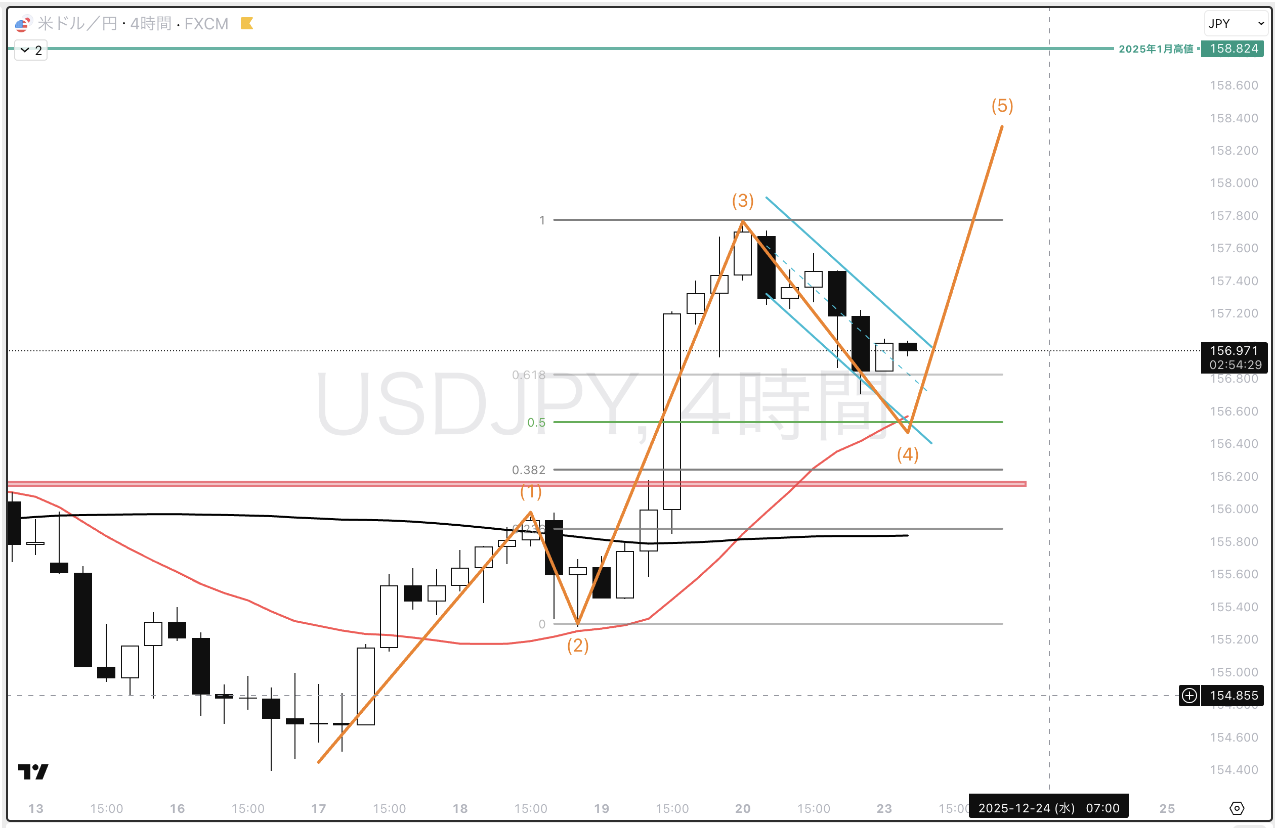 4時間足では上昇中。4波の調整波で下げている最中。フィボ、サポートライン、チャネルなどを見ても、まだ調整波が下がる余地はありそう。