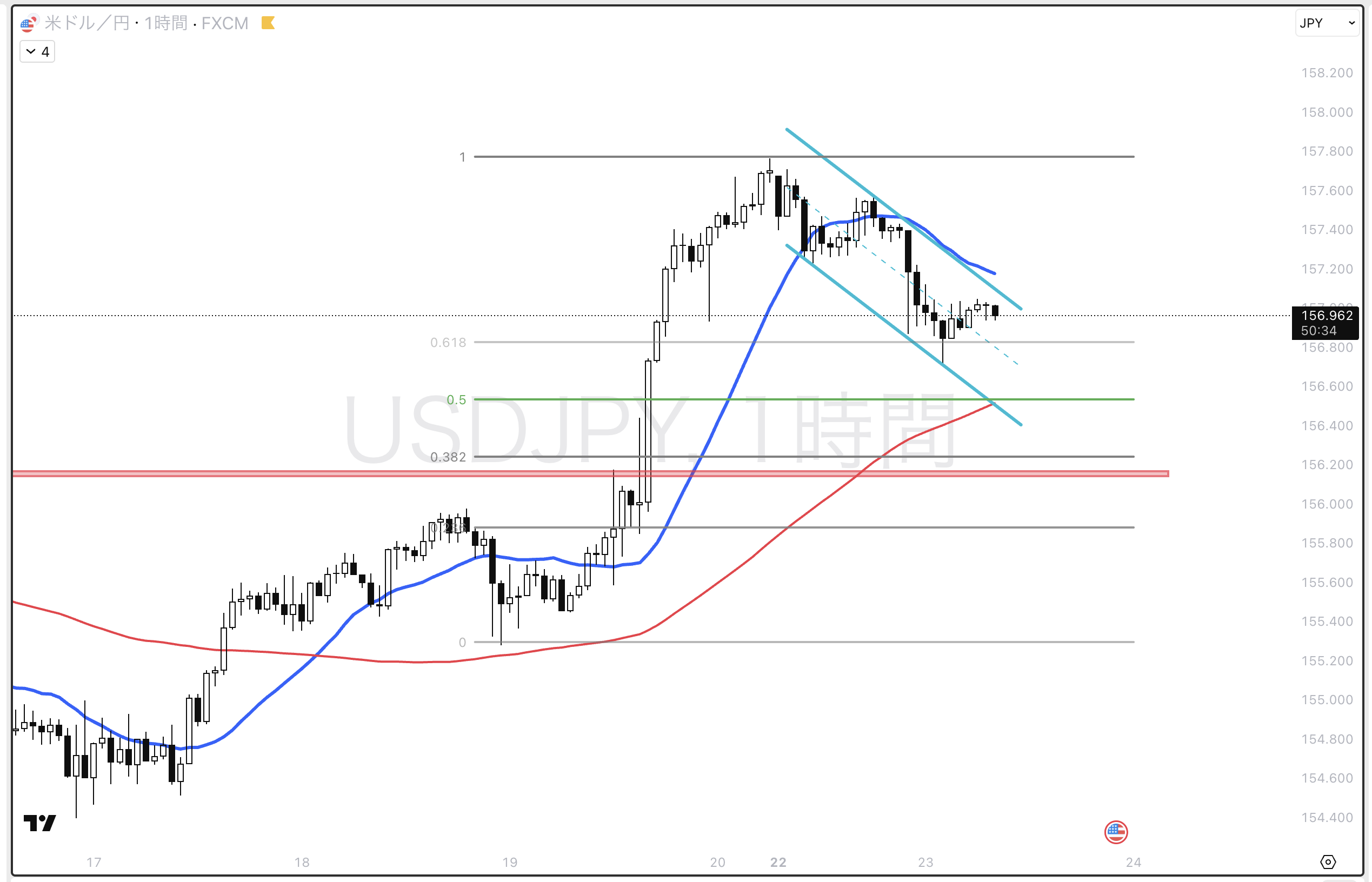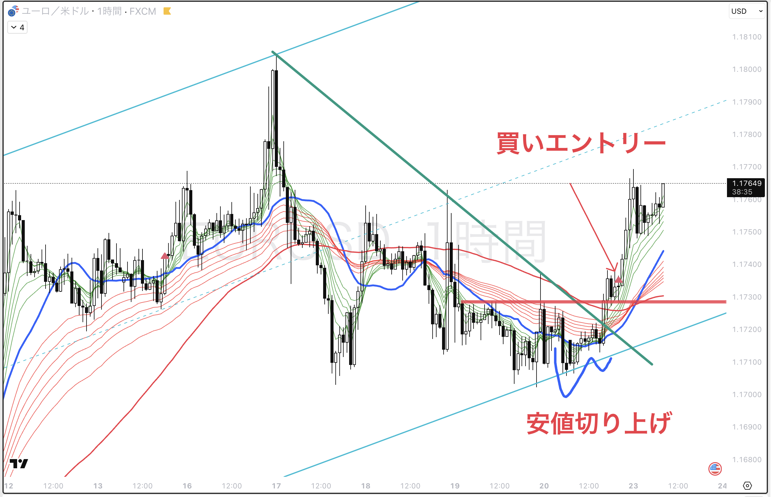 1時間足は下降中。水色並行チャネルの上限あたり。まだ下落の余地はある。maサンドだし、上位と波の方向あってないし、手を出せない。