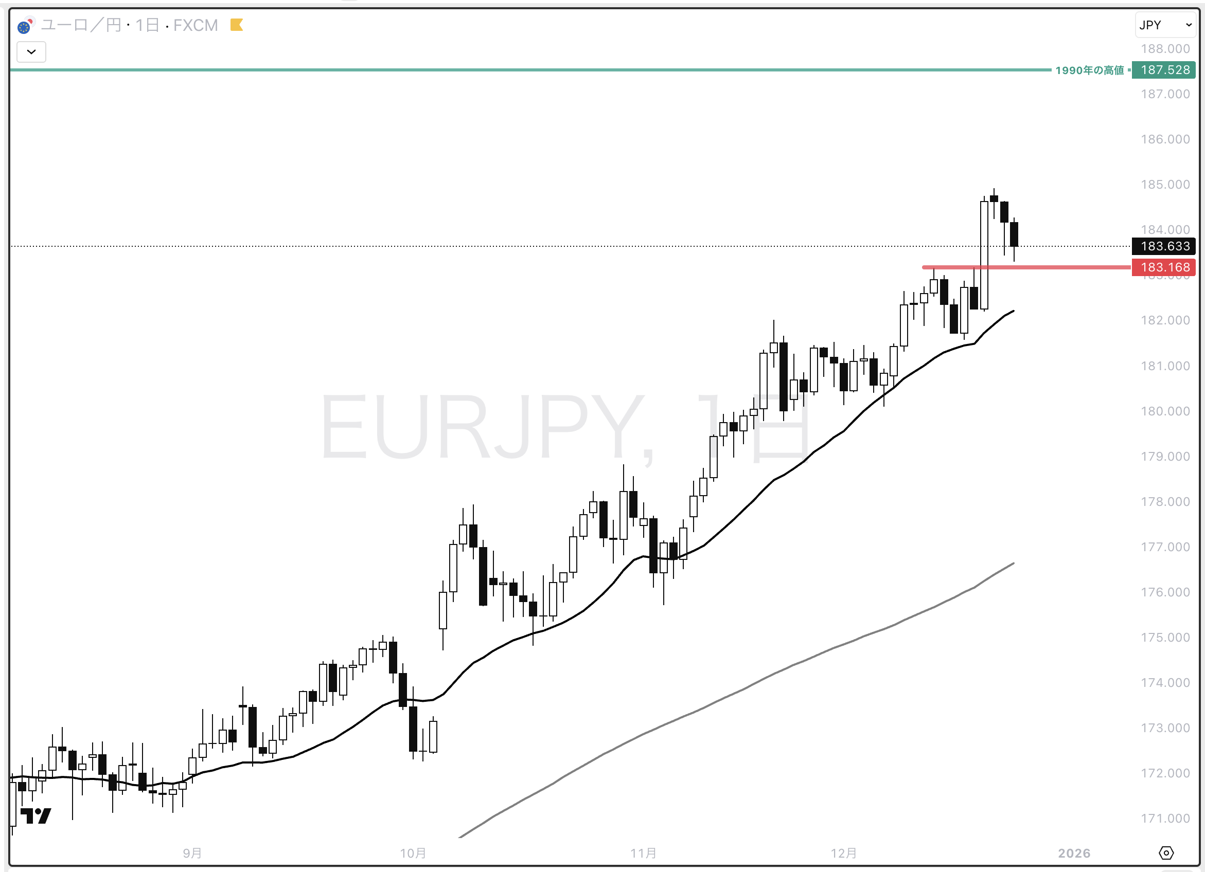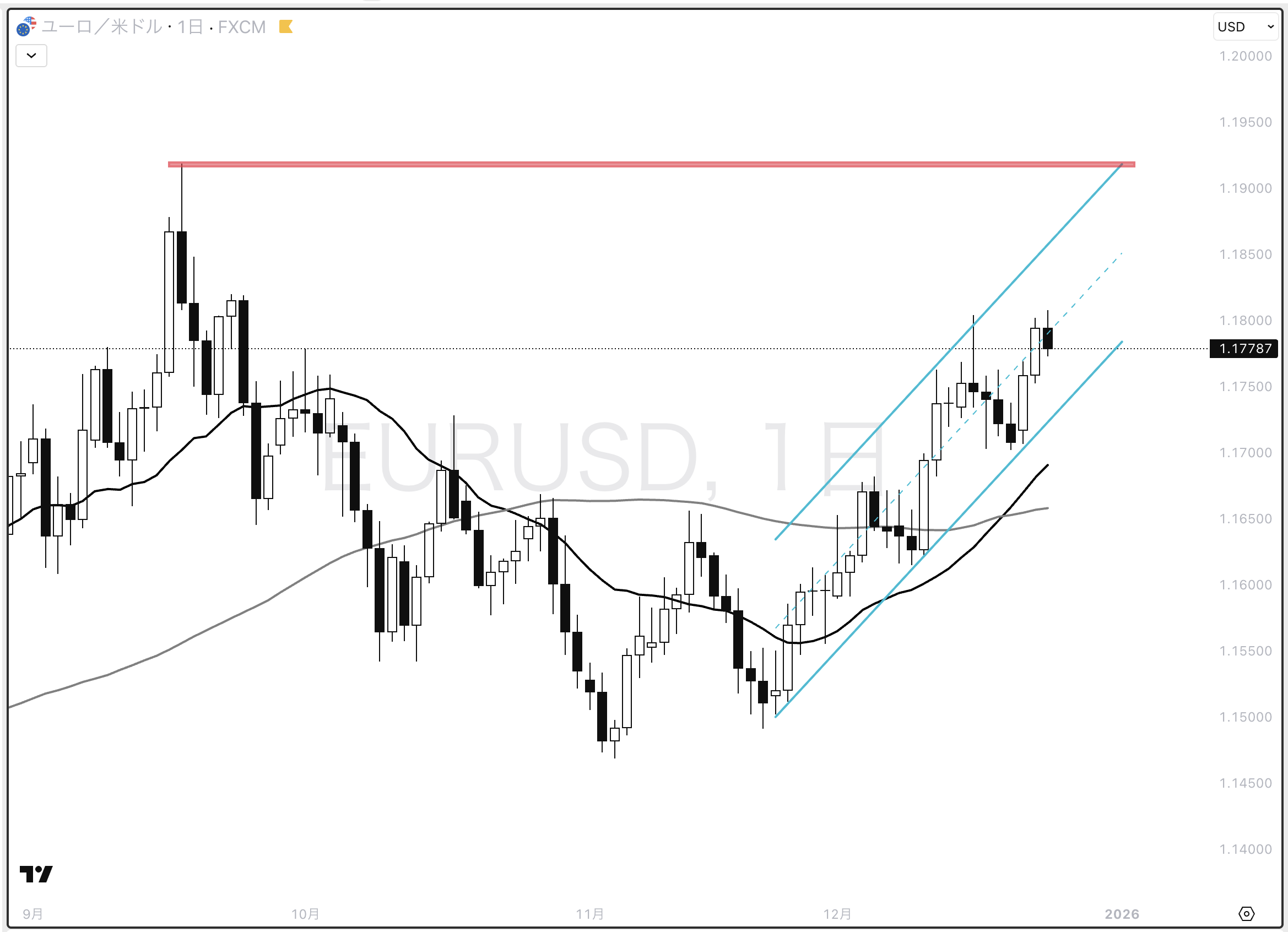 ユーロ強い。上昇トレンド中、調整で3日間陰線が続きました。