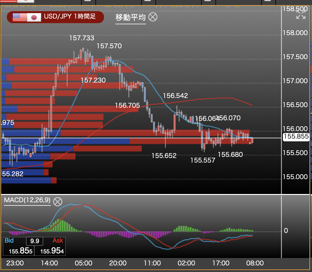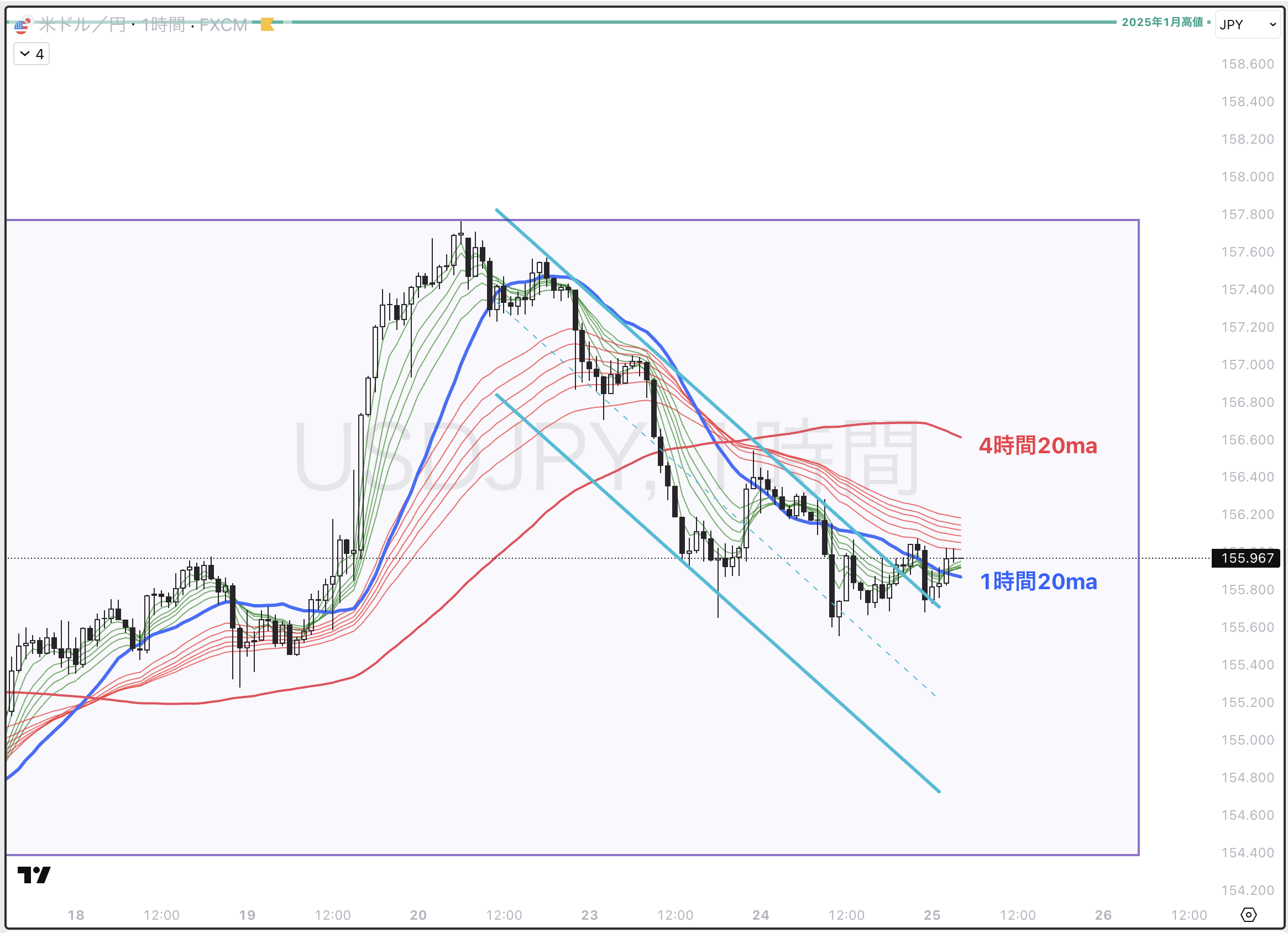 4時間20ma(赤)と1時間20ma(青)の間、紫BOXレンジの中で売り買い拮抗。