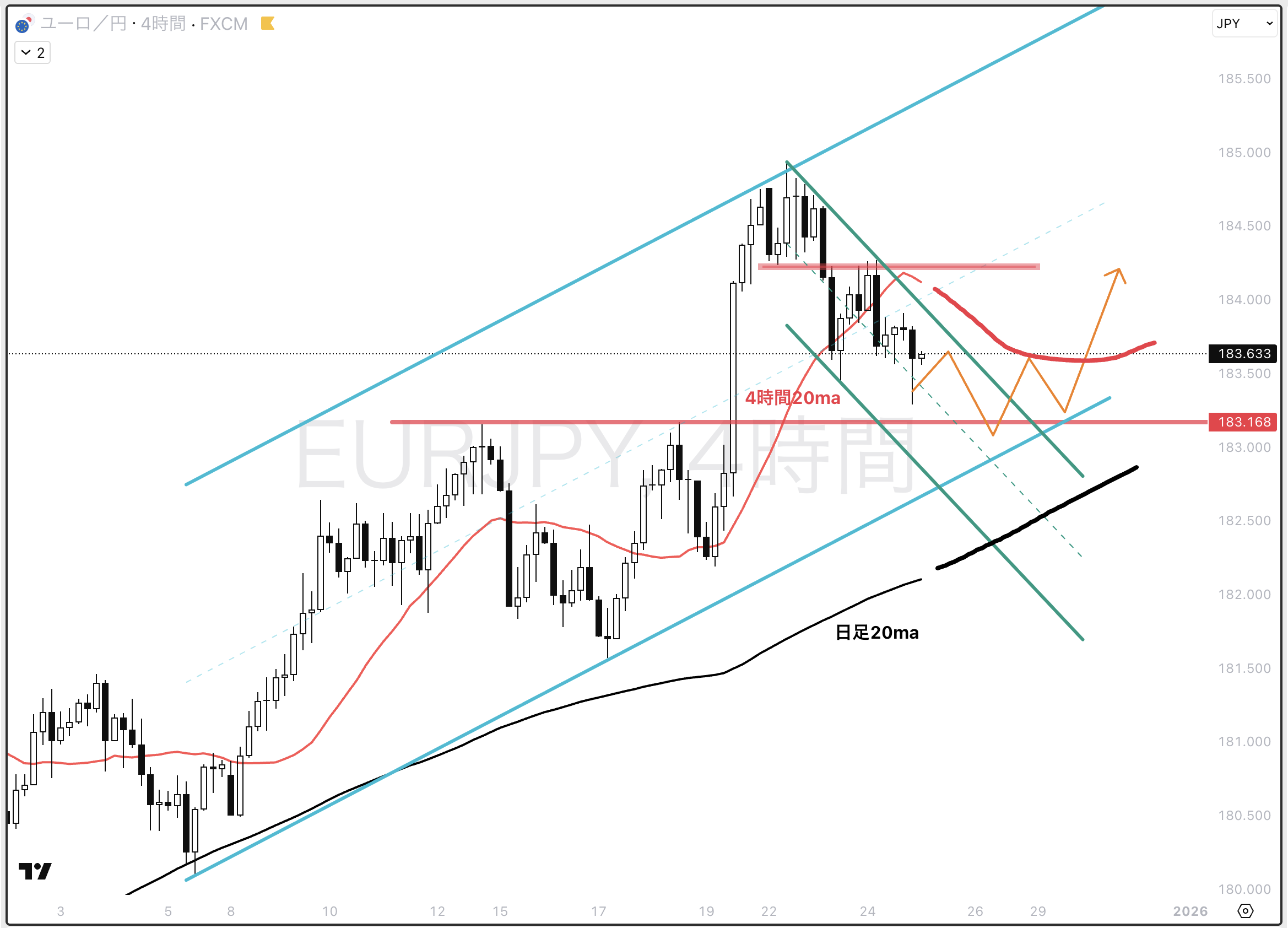 フィボ38.2%、50%、61.8%、それぞれいい節目ある。フィボ61.8%は水色平行チャネルの下限あたりではあるが、4時間20ma(赤)はそのころ下向きになっているはず。買いの優位性がかなりなくなっているかも。