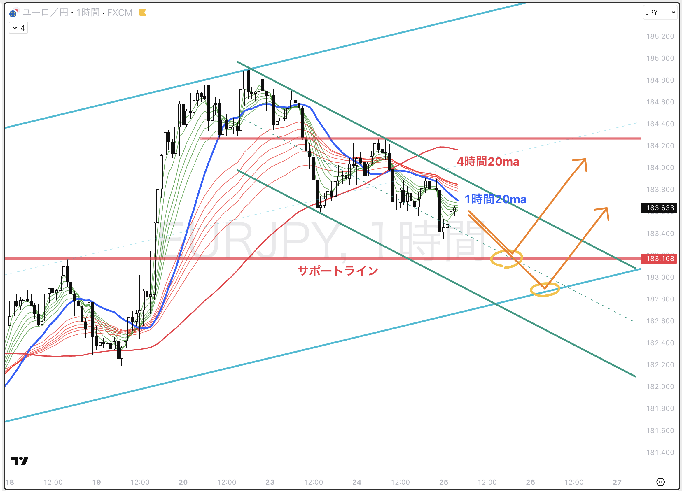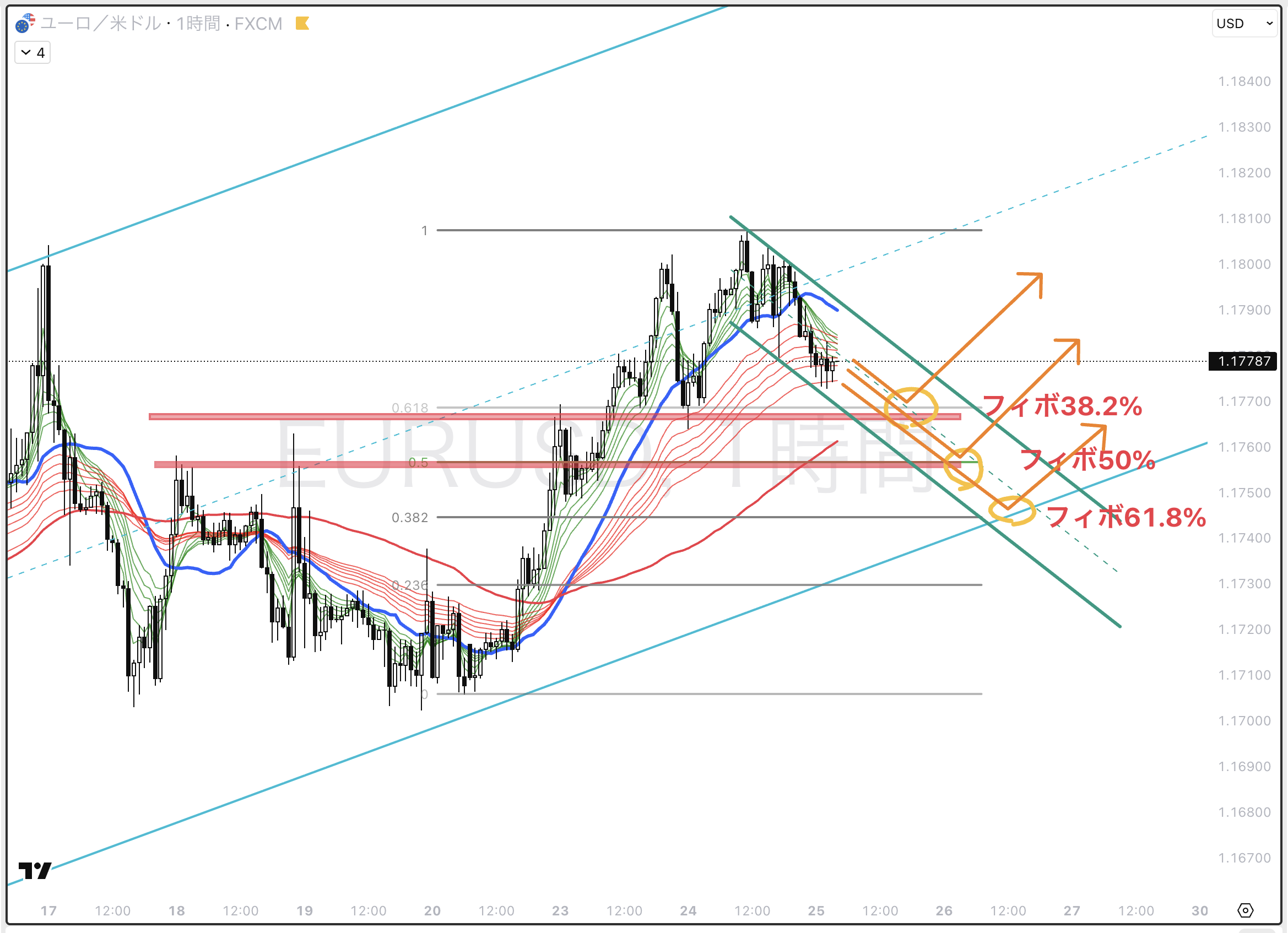 4時間足の調整波中で、1時間足下降トレンド(緑のチャネル内)。サポートラインまで下がってから反発するか、水色平行チャネルの下限まで下がってから反発するか…。