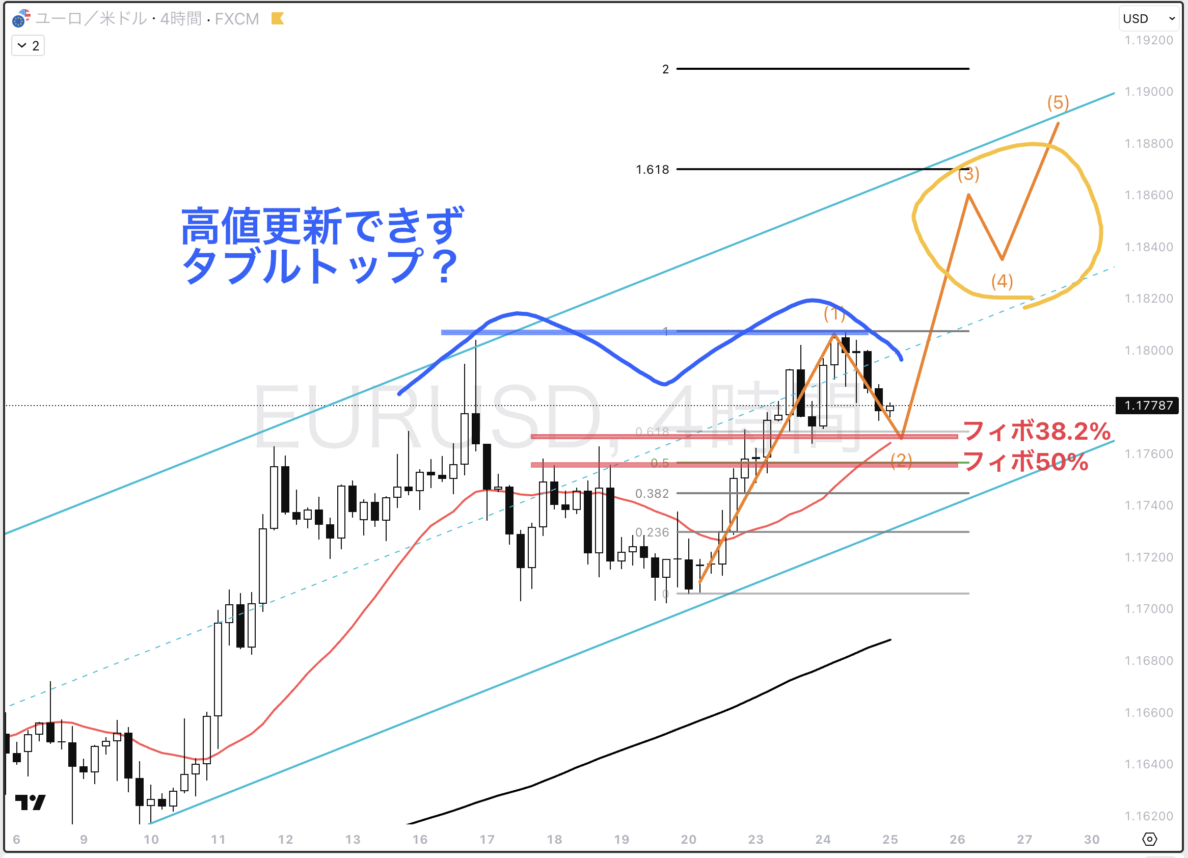フィボナッチ38.2%か50%まで調整してから上昇3波にいってくれたらキレイな形だと思うんだけどな〜。