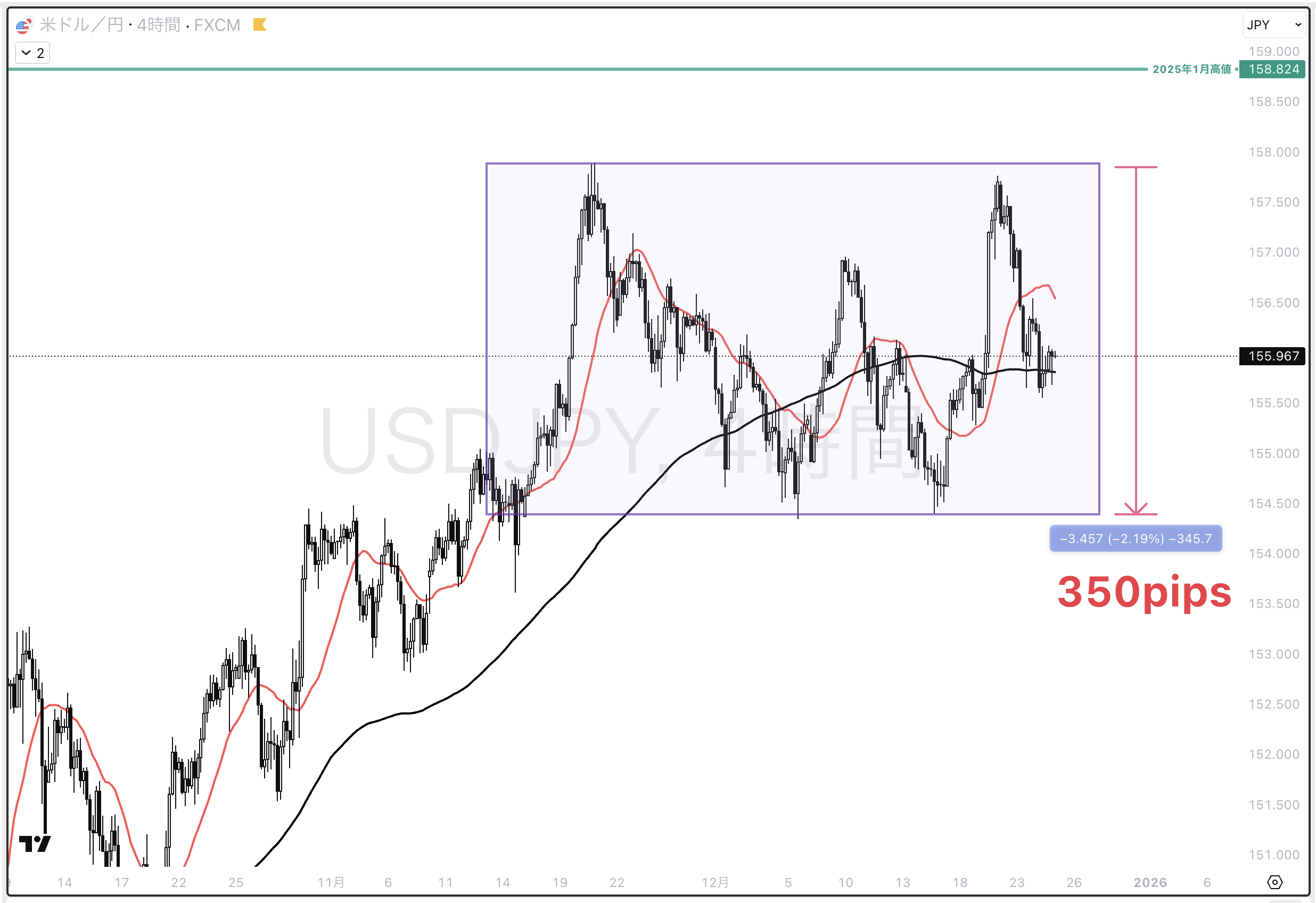 BOXの上下で350pipsもある。現在レートはちょうど真ん中あたり。