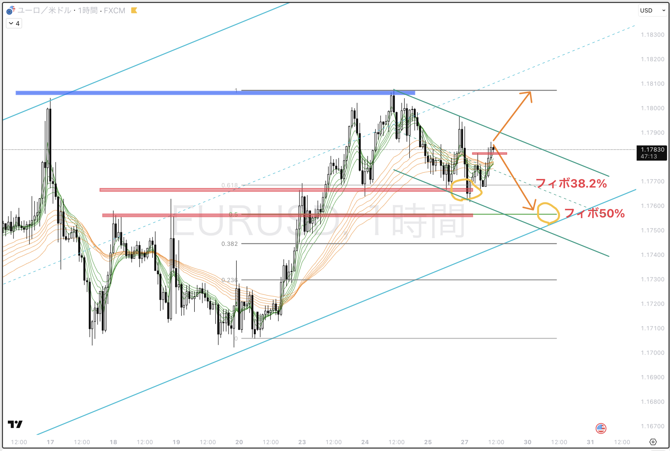 4時間上昇トレンドの調整波、1時間下降中(緑チャネル)。フィボ38.2%のところで反応した。