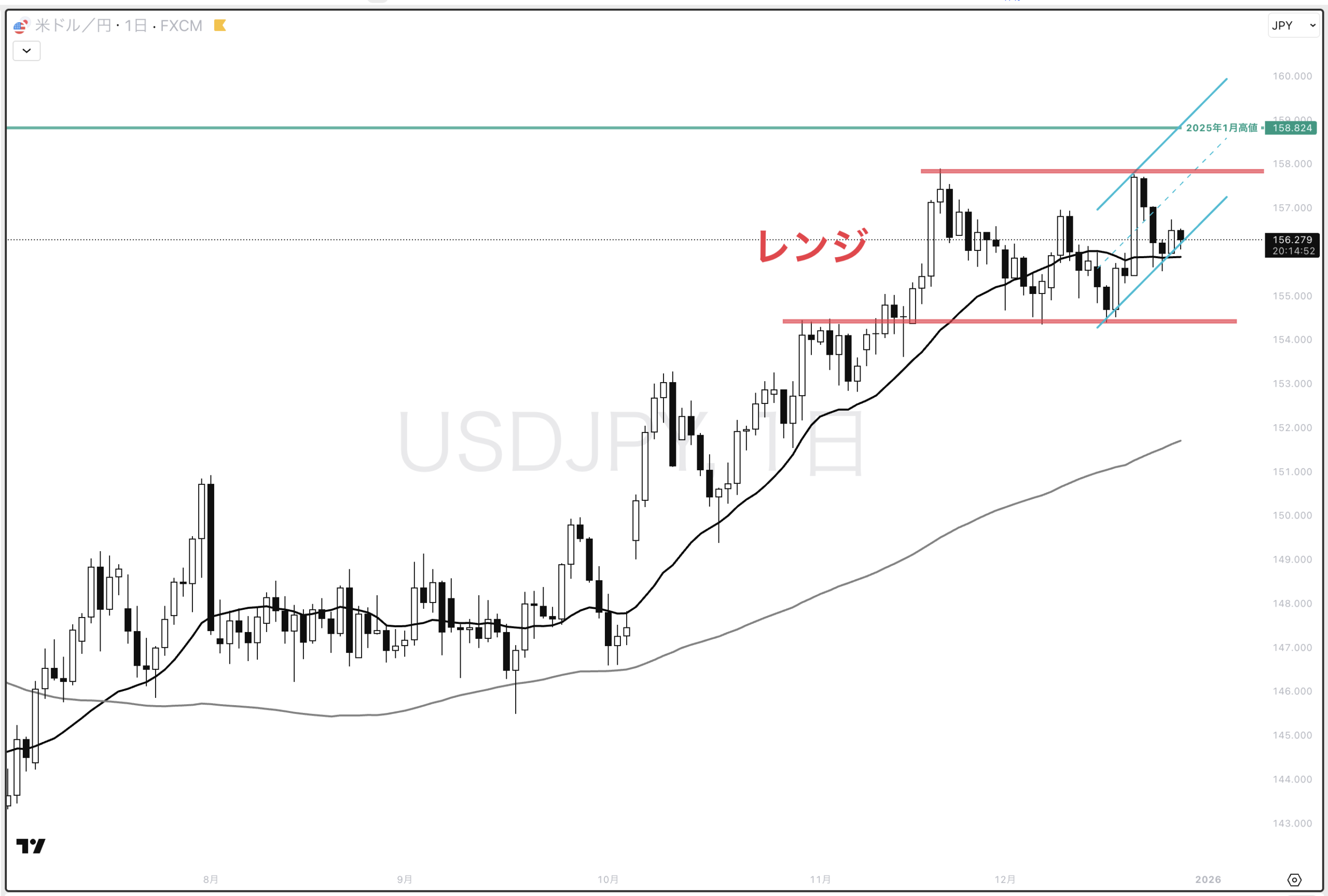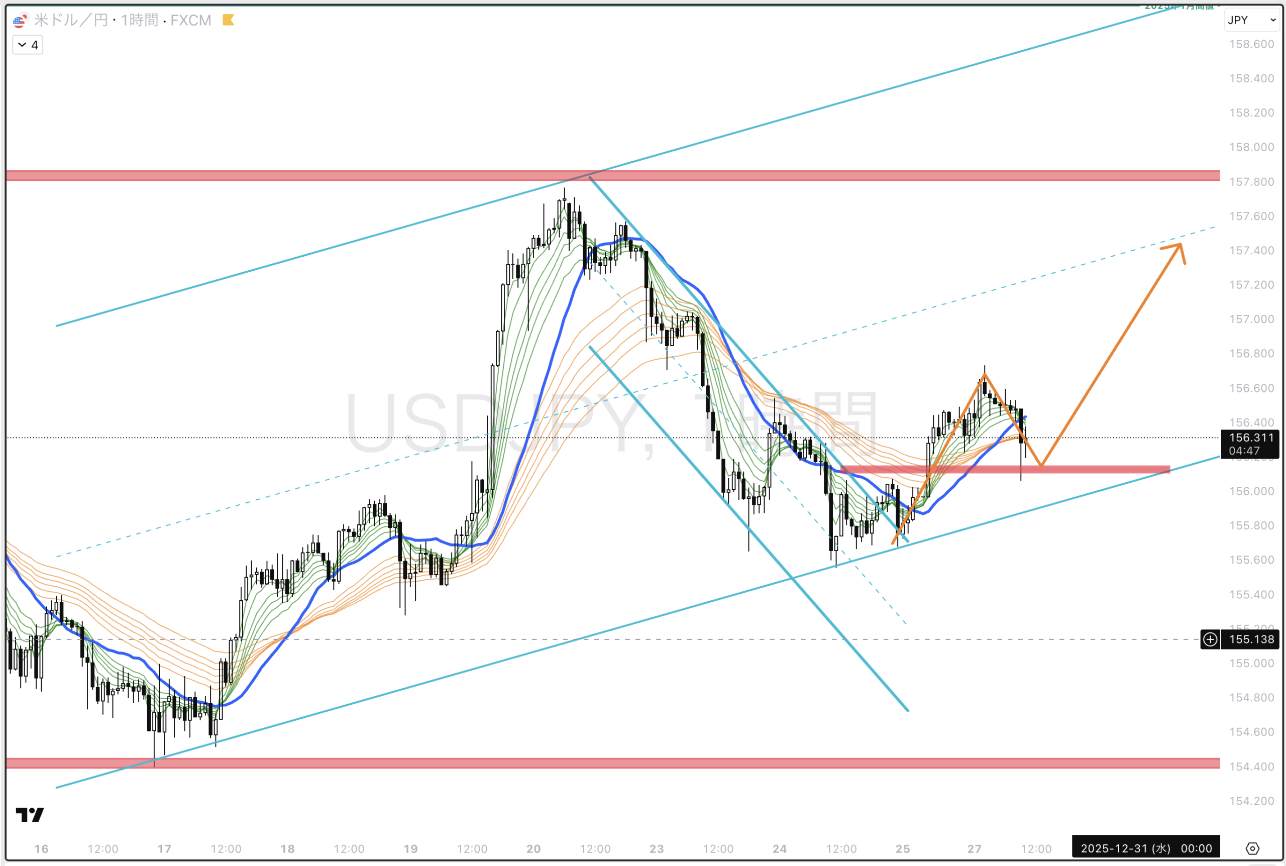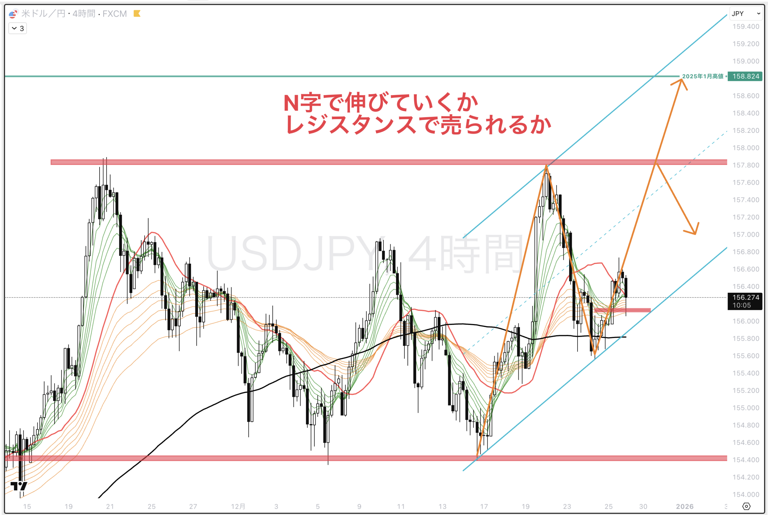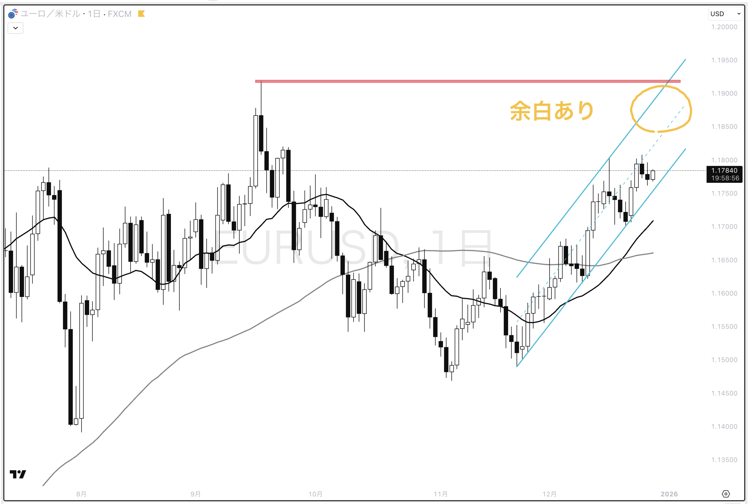 4時間でみると、直近高値を超えて水色チャネル内上昇トレンド中。水色チャネル上限まで伸びていけば綺麗なN字に見える。日足20ma(黒)がヨコヨコなのでまだレンジの可能性もある。