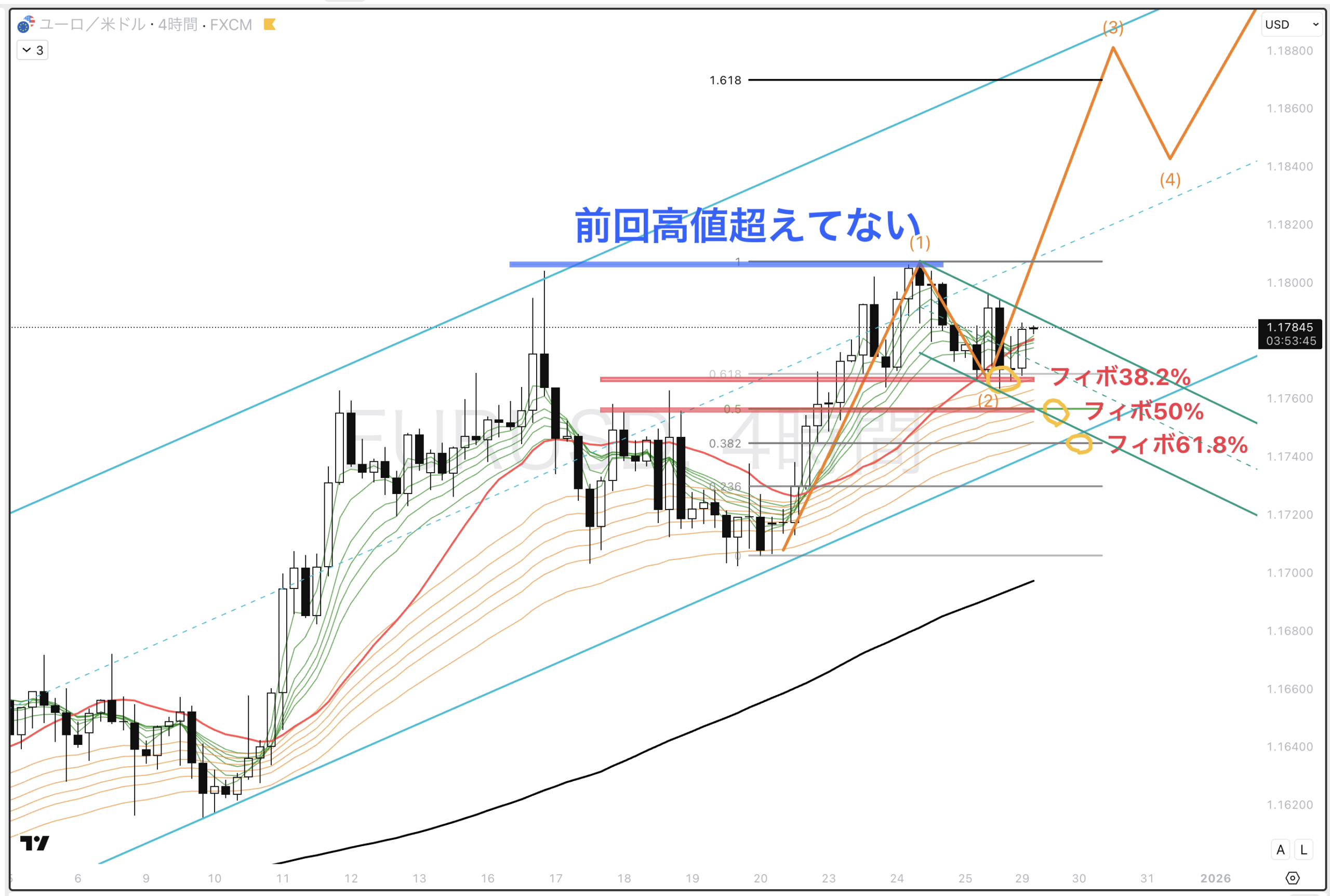 上昇中だけど、前回高値を超えてはいない。現在調整波で下降中(緑チャネル)。フィボ38.2%で反応したけど、50% 、61.8%まで下がるかもしれない。