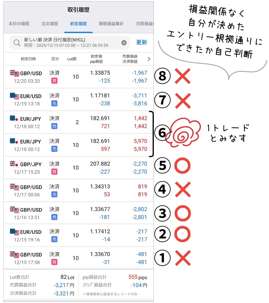 8回のエントリーを全て振り返って、自分が決めたエントリー根拠(マイルール)に従ってトレードできたかどうかマルバツで自己評価してみました。
