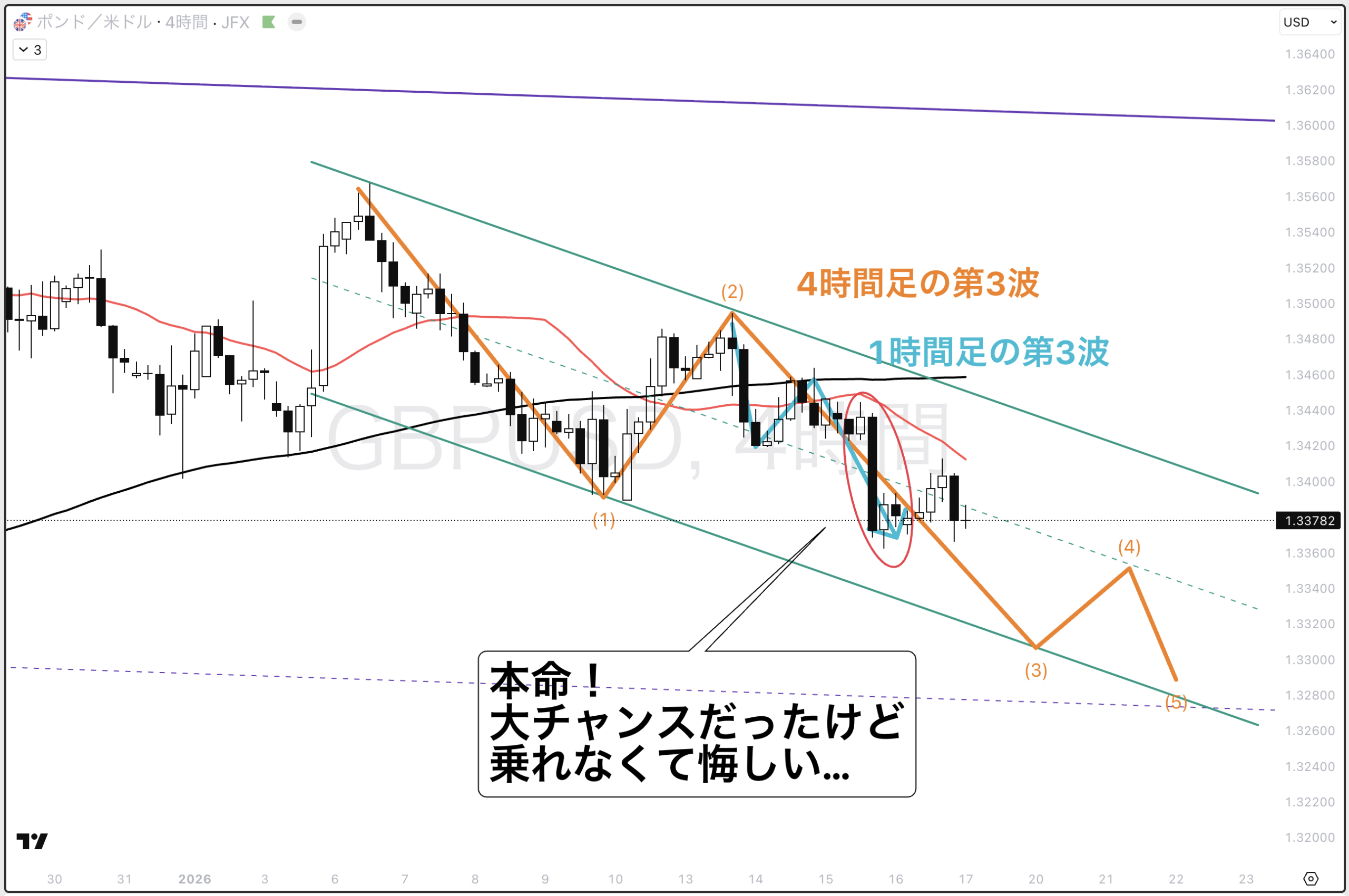 今週、週初めから狙いを定めていたのはポンドドルのショートでした。 1月15日(木)のロンドン時間、4時間足の第3波と1時間足の第3波が重なる、まさに「絶好の本命ショートチャンス」が到来!