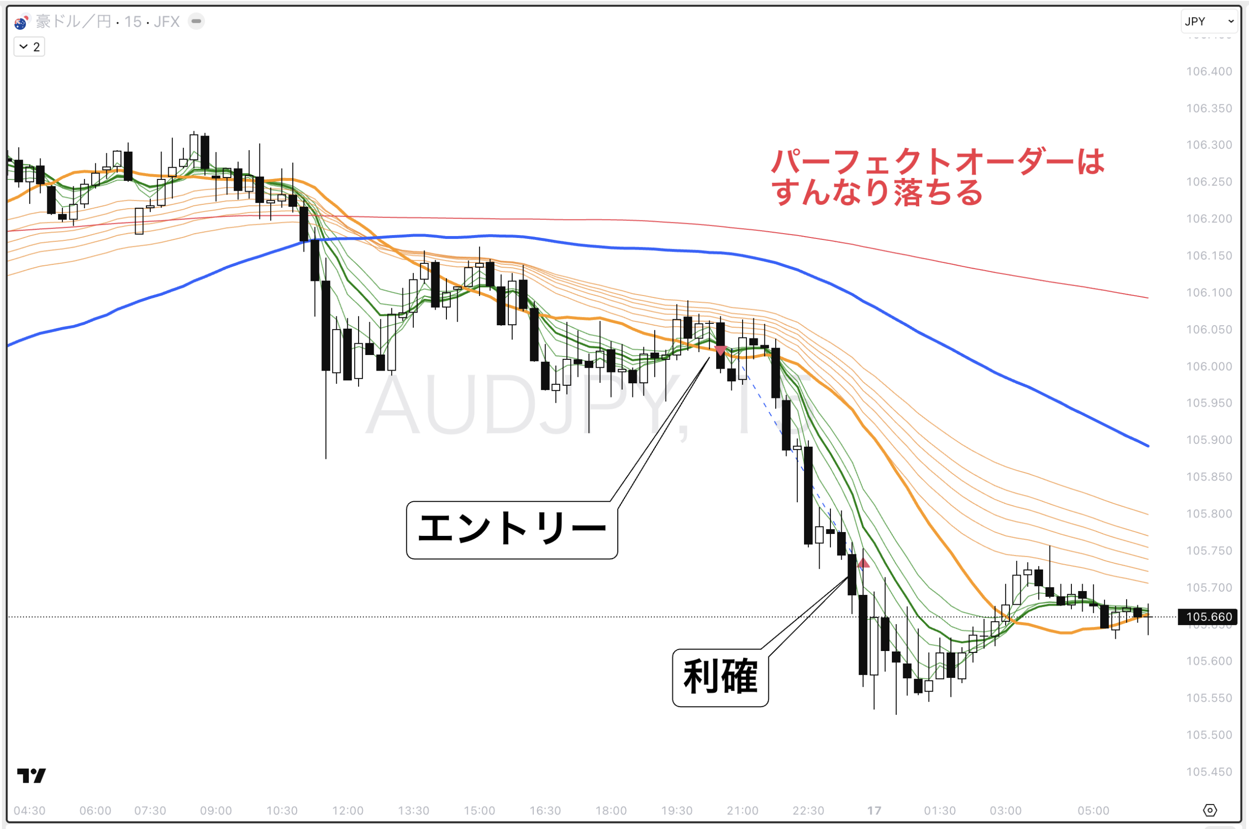 - 勝てた局面:MAがパーフェクトオーダーになり、トレンドの向きが確定していた場所。
