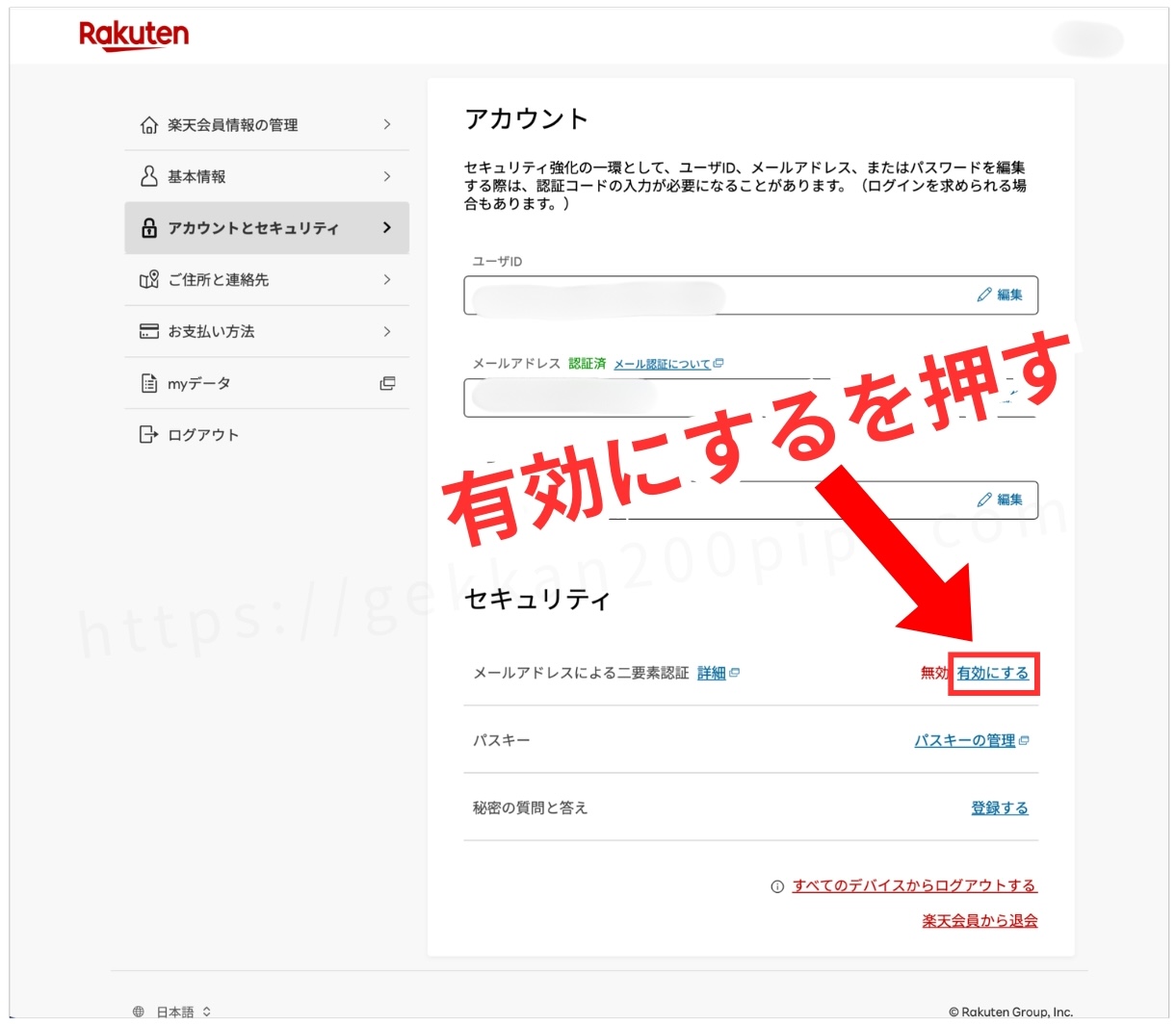 セキュリティの「メールアドレスによる二要素認証」が無効になっていたので、「有効にする」を押します。↓