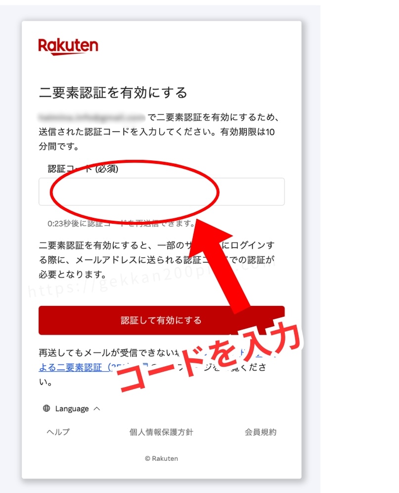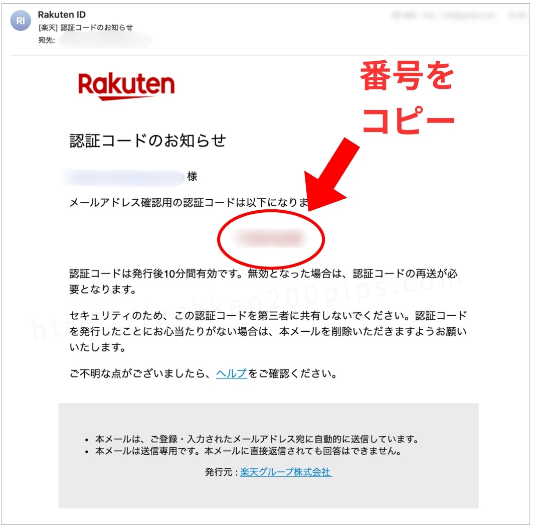 メールに認証コードが届くので番号をコピーします。↓