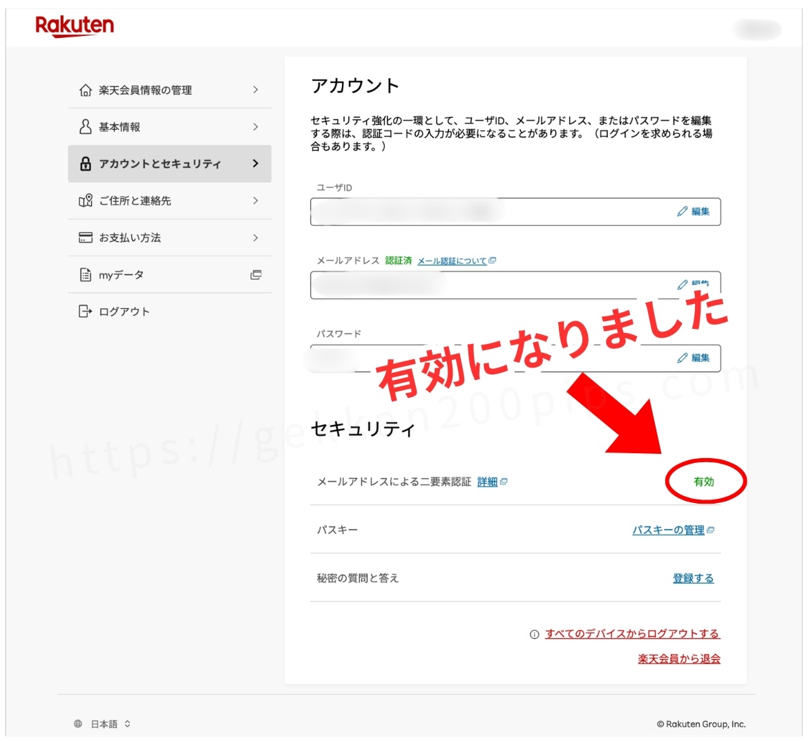 「メールアドレスによる二要素認証」が緑色の「有効」に変わりました↓