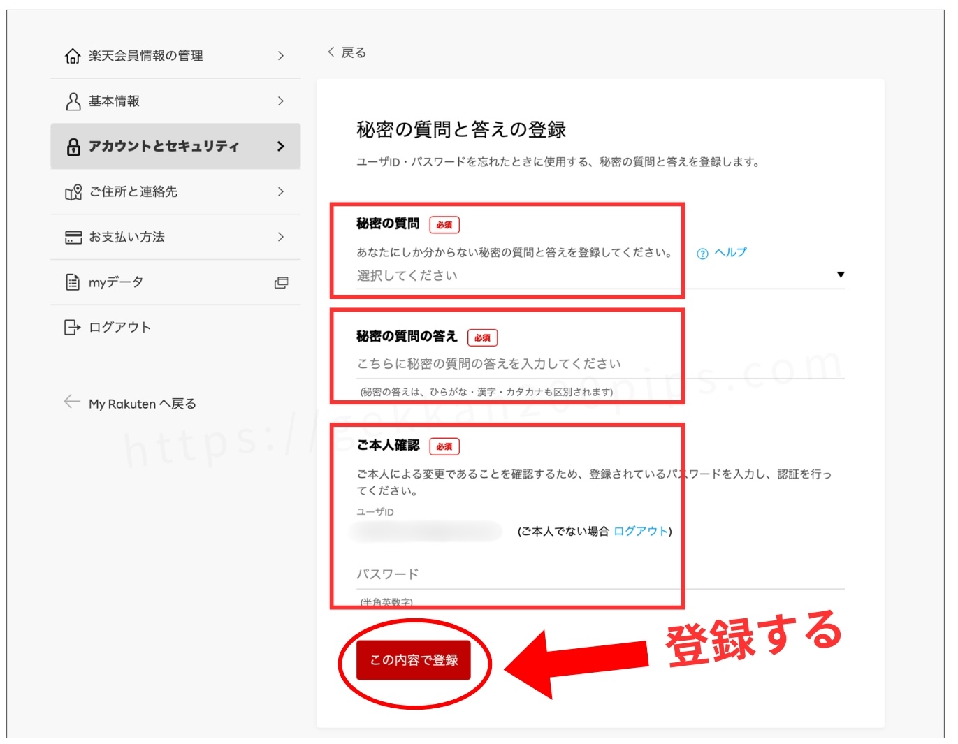 秘密の質問と答えを入力「この内容で登録」を押します。